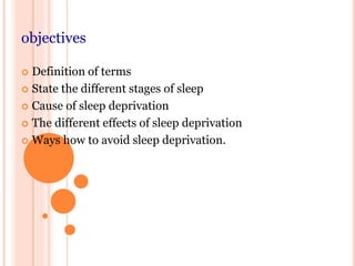 Sleep is a natural behavior that is divided into stages and is important for physical and mental health. Lack of sufficient sleep, known as sleep deprivation, can be caused by factors like medication, lifestyle, caffeine, and stress. Effects of sleep deprivation include increased risk of health issues like heart disease and diabetes, as well as mental impacts such as impaired memory, mood changes, and reduced cognitive performance. To avoid sleep deprivation, one should exercise regularly, take naps, maintain a consistent sleep schedule, and reduce caffeine and alcohol intake close to bedtime.