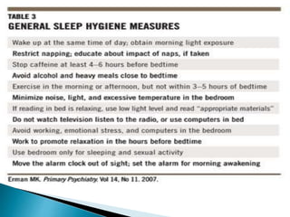 The document outlines various primary sleep disorders, specifically dyssomnias and parasomnias, including their classifications, symptoms, and treatment options. It discusses conditions such as insomnia, hypersomnia, narcolepsy, and breathing-related sleep disorders (BRSD), detailing their causes, diagnoses, and physiological impacts. Treatment recommendations include both non-pharmacological methods like sleep hygiene and behavioral therapy as well as pharmacological interventions for specific cases.