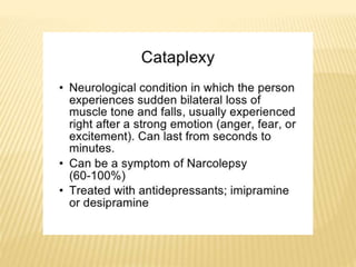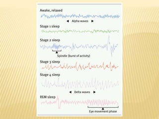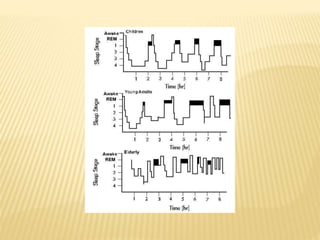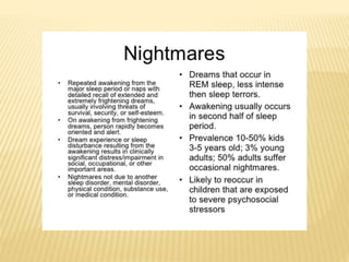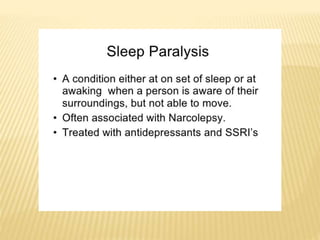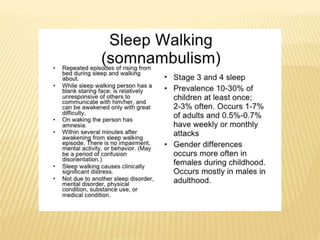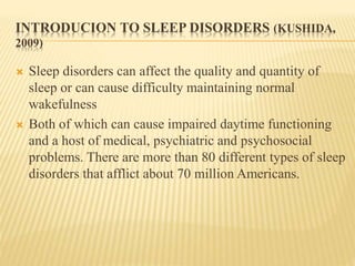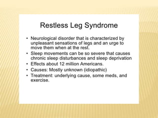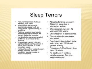 This document provides an overview of sleep disorders including insomnia, hypersomnia, narcolepsy, breathing-related sleep disorders, circadian rhythm disorders, parasomnias, and jet lag. It discusses the stages of normal sleep including light, intermediate, deep, and REM sleep. It covers causes, symptoms, and treatments for different sleep disorders. The functions of sleep are also reviewed including restoring the body, boosting immunity and mood, and facilitating memory processing.