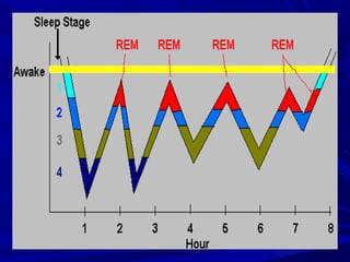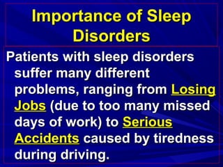 This document discusses sleep disorders, their causes, symptoms, diagnosis, and treatment. It covers several types of sleep disorders including insomnia, hypersomnia, circadian rhythm disorders, and parasomnias. Insomnia is difficulty falling or staying asleep and can be acute or chronic. Hypersomnia involves excessive daytime sleepiness and is often caused by sleep apnea, narcolepsy, or myoclonus. Circadian rhythm disorders disrupt normal sleep-wake cycles. Parasomnias distort normal sleep architecture and include sleepwalking and REM behavior disorder. Diagnosis involves medical history, observation, exams, and tests. Treatment goals are reducing morbidity, mortality, and improving quality of life.