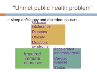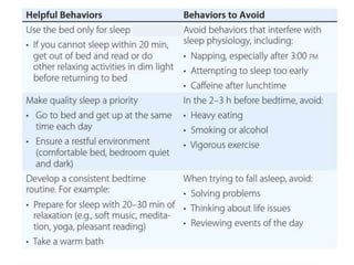 This document discusses various sleep disorders and approaches to evaluating and treating patients with sleep problems. It covers topics like insomnia, obstructive sleep apnea, narcolepsy, restless leg syndrome, circadian rhythm disorders, and parasomnias. The key points are obtaining a thorough patient history, performing tests like polysomnography and multiple sleep latency tests to diagnose the underlying cause, and treating the specific disorder through lifestyle changes, medications, CPAP, or other therapies.