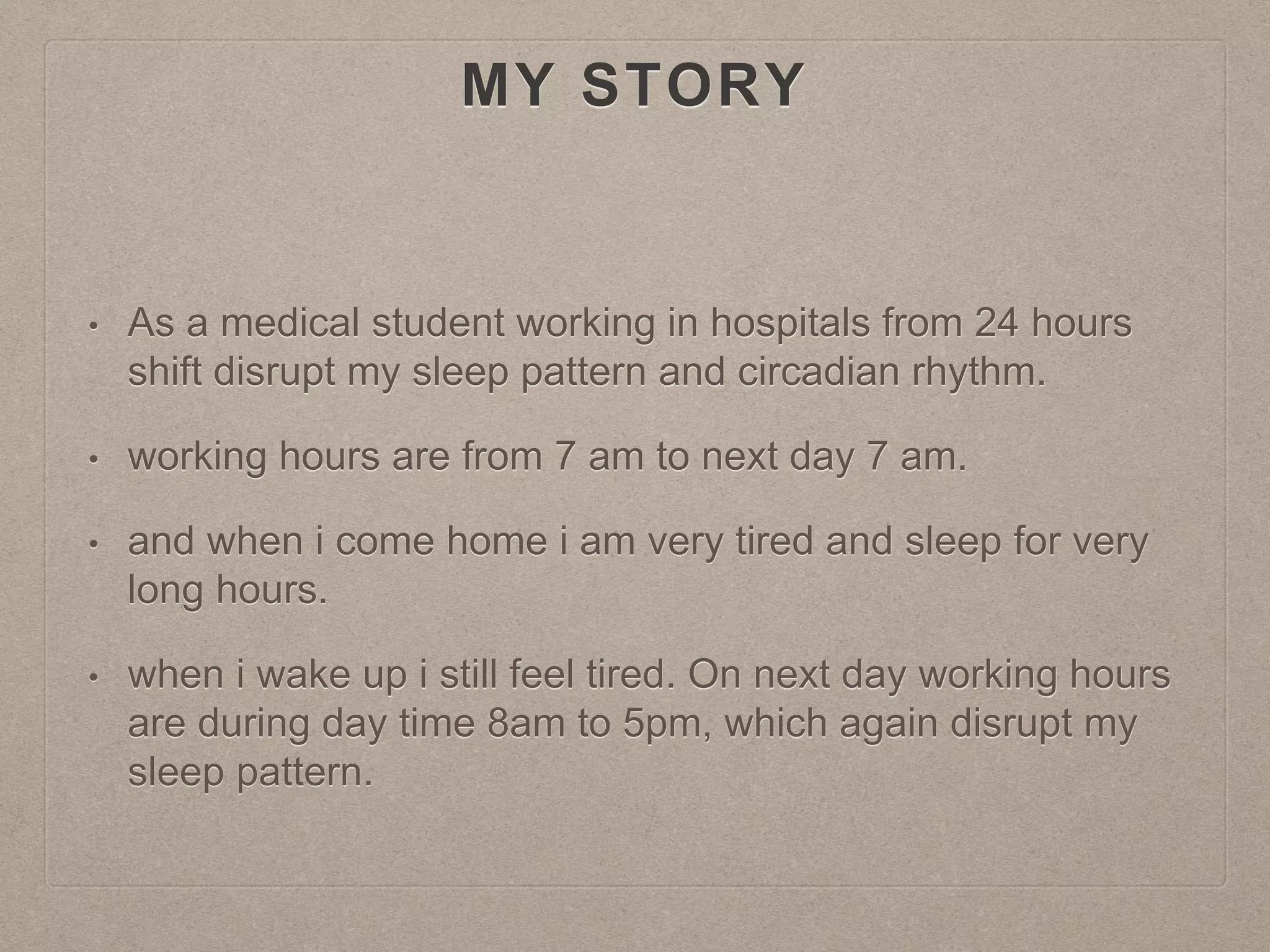 Faraz Tak's sleep pattern and circadian rhythm were disrupted by his 24-hour work shifts as a medical student. During shifts, his melatonin release was not sufficient at night due to artificial light exposure, preventing him from falling asleep. To remedy this, he created a dark environment when sleeping during the day to trick his brain into thinking it was nighttime and releasing melatonin, allowing him to get a more restful sleep.