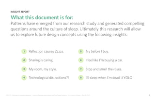 This document contains insights from a qualitative study about sleep patterns. Seven key insights are discussed: 1) Reflection causes Zzzzs - users monitor their sleep through reflection and technology. 2) Sharing is caring - users adapt habits due to sharing bedrooms. 3) My room, my style - users see their bedroom as an extension of themselves. 4) Technological distractions?! - users see technology as distracting from sleep. 5) Try before I buy - users want to try products before purchasing. 6) I feel like I'm buying a car - purchasing bedroom items feels intimidating. 7) Stop and smell the roses - users strive to find relaxation in their routines. For each insight, opportunities are identified and potential design