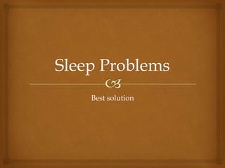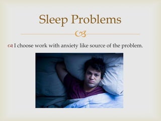 The document provides solutions for sleep problems caused by anxiety. The best solution is to identify the source of anxiety, such as troubles at work. A favorite solution is to get organized by writing down thoughts, organizing them, and creating a to-do list. Organizing one's life has benefits like staying focused to finish work tasks, gaining more free time, and making the most of each day.