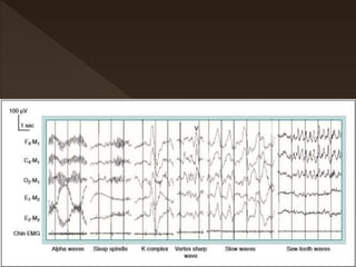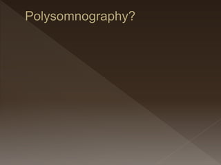 The document discusses the parameters that are measured during a polysomnography exam, including sleep parameters (EEG, EOG, EMG), respiratory parameters (thoraco-abdominal belts, pressure/thermal flow, SpO2), limb movement parameters (leg EMG), and cardiac parameters (ECG). It also covers how sleep stages are scored in 30 second epochs according to AASM standards. Respiratory events like apneas and hypopneas are scored based on reductions in airflow as measured by sensors.