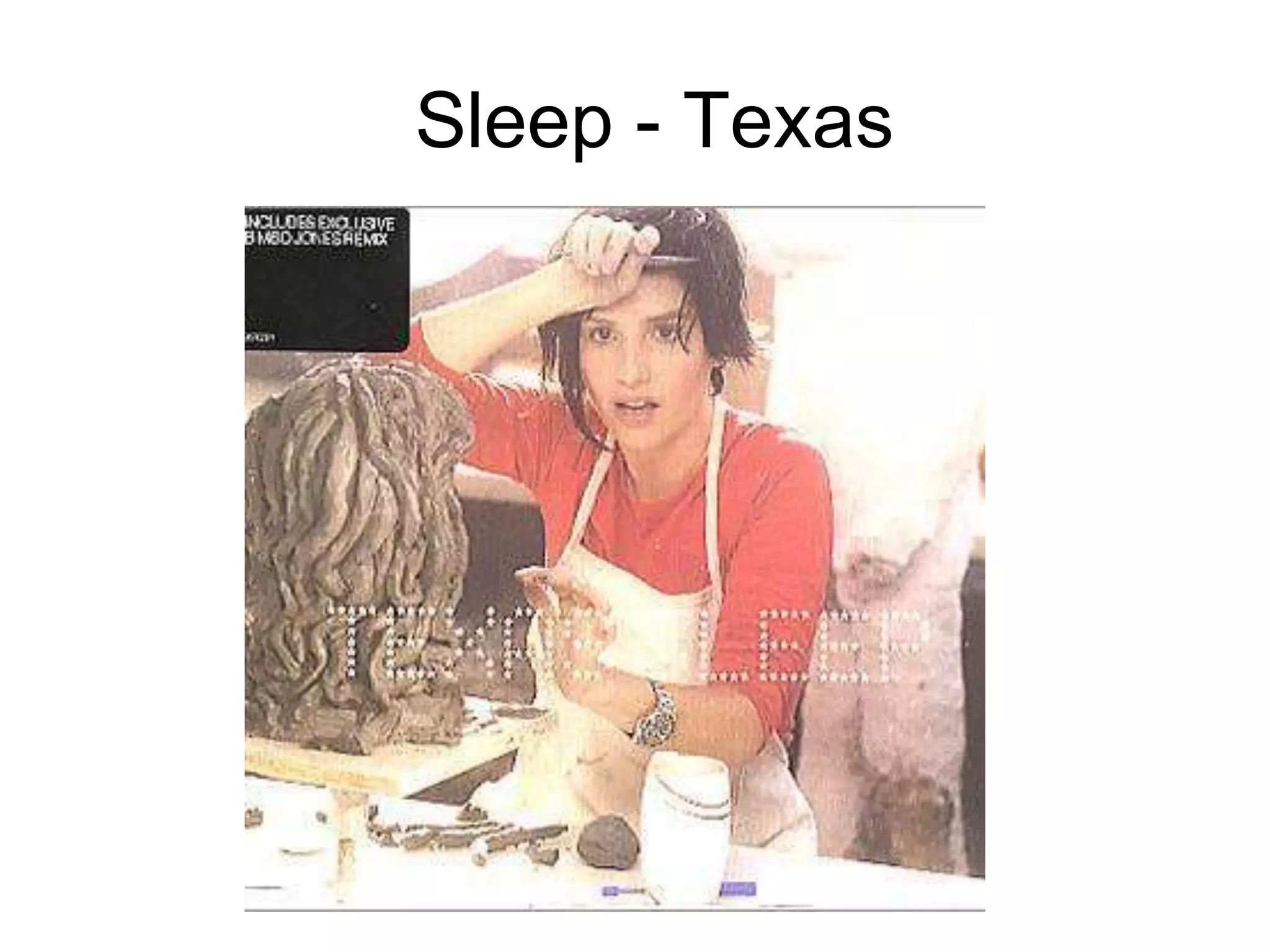 The music video for the song "Sleep" by the band Texas starred comedian Peter Kay. In the video, Kay plays his character Marc Park performing with Texas in a social club. Scenes from the video spoof popular music videos and films by recreating famous scenes but with Kay and the lead singer in the starring roles. At the end, it is revealed that the entire video took place in a dream of Kay's character, who is shown actually being a parking warden asleep.