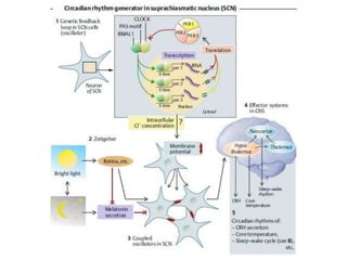 This document discusses the sleep-wake cycle and circadian rhythms, highlighting the role of the suprachiasmatic nucleus as the central biological clock. It details how external zeitgebers, particularly light, synchronize this cycle and provides average sleep durations across different age groups. Additionally, it describes the physiological importance of sleep for recovery and cognitive functions such as memory consolidation.