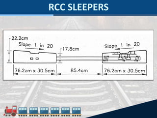 The document discusses railway sleepers, which are essential components that support and stabilize railway tracks by distributing loads from the rails to the ballast underneath. It details various types of sleepers, including wooden, metal, and concrete, along with their advantages, disadvantages, and maintenance considerations. Additionally, it covers requirements for ideal sleepers, treatments for wooden sleepers, and the correlation between sleeper types and railway performance.