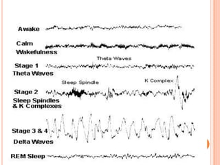 This document provides an overview of sleep and sleep disorders. It defines sleep and describes the physiology and stages of normal sleep. It discusses factors that influence sleep such as circadian rhythms, neurotransmitters, and the sleep-wake cycle. Common sleep disorders are explained like insomnia, narcolepsy, sleep apnea, restless leg syndrome and parasomnias. Assessment methods and treatment options for sleep disorders are also summarized.