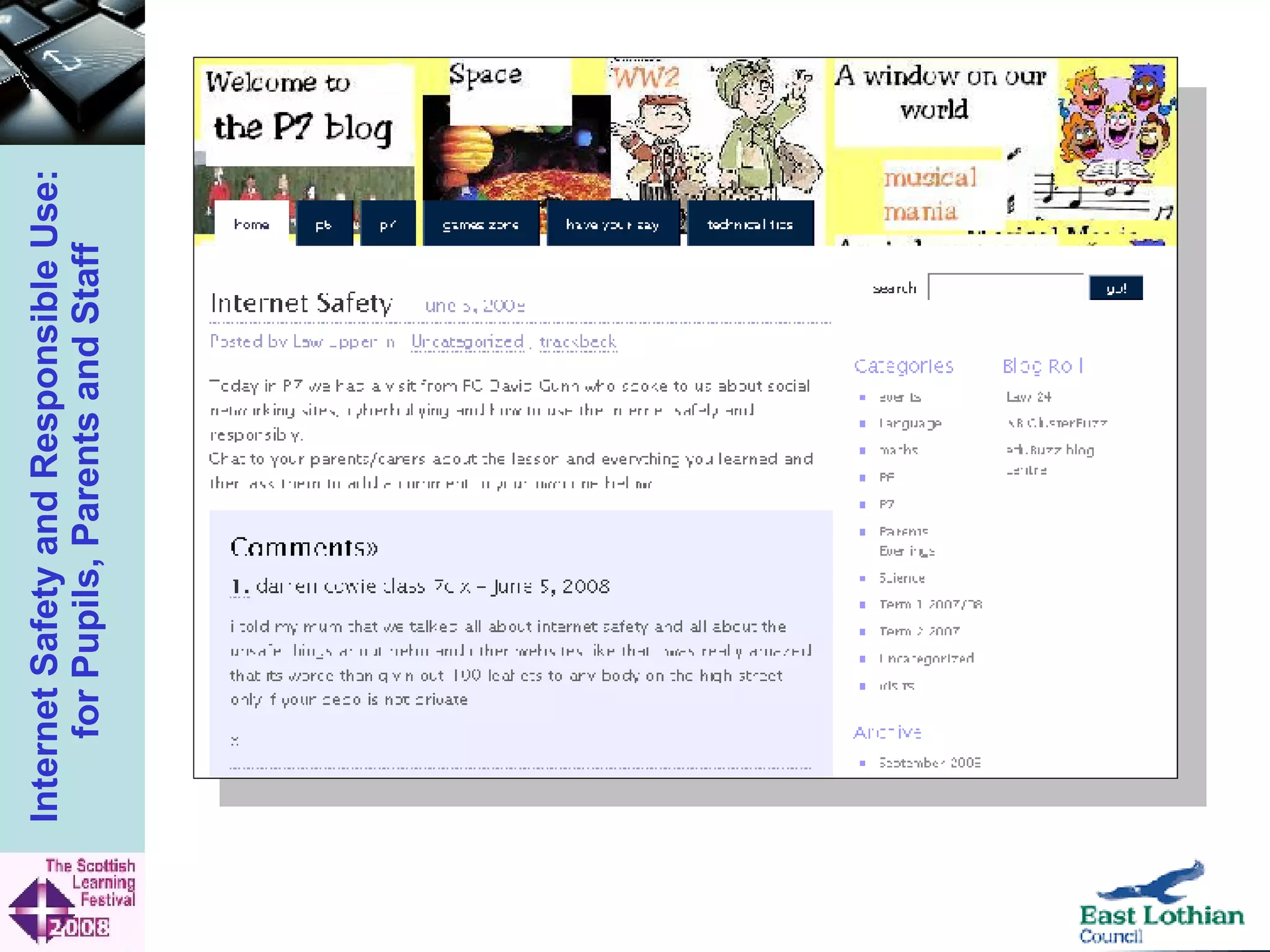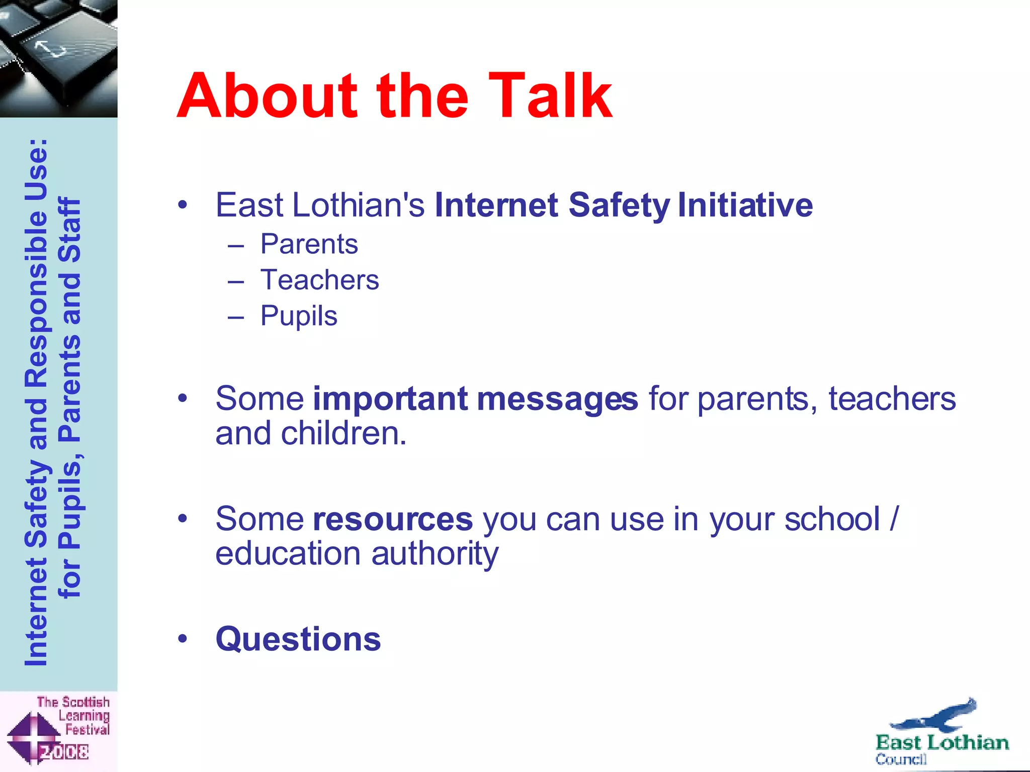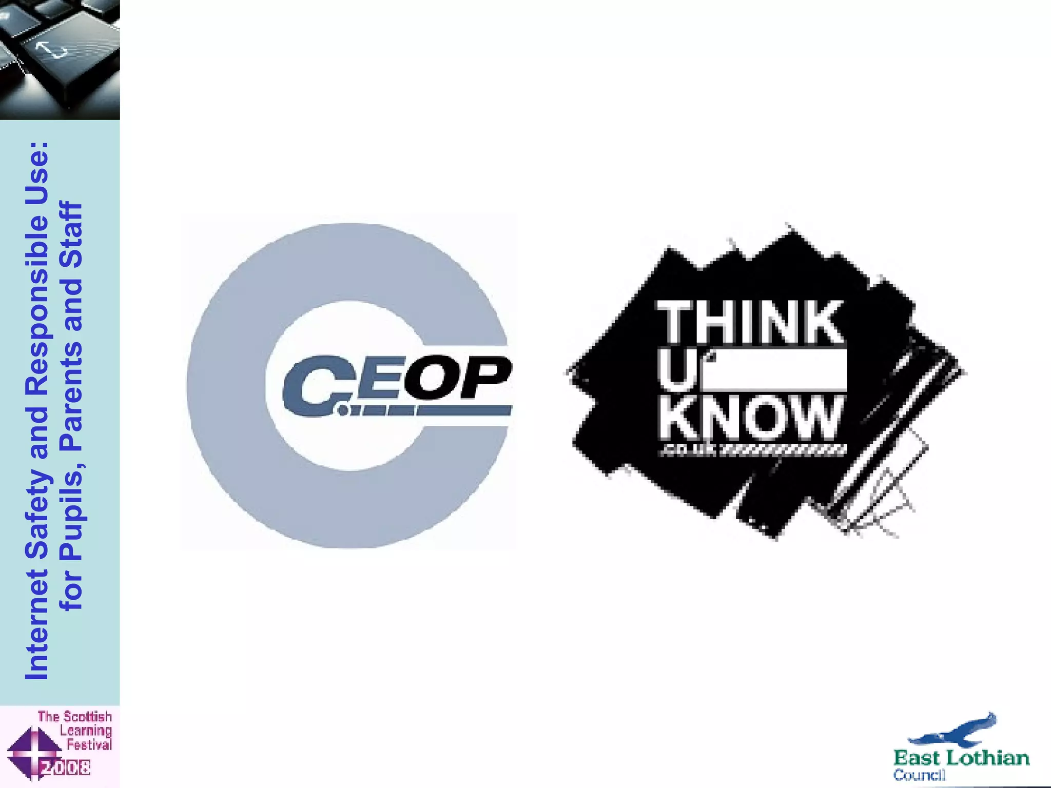 The document outlines East Lothian Council's internet safety and responsible use initiative aimed at educating pupils, parents, and staff about online dangers and safe practices. It emphasizes the importance of educating parents and engaging the school community in teaching digital literacy through resources like 'Think U Know' and programs for various age groups. Additionally, it highlights the benefits of the internet while warning against potential dangers, including online abuse and inappropriate content.