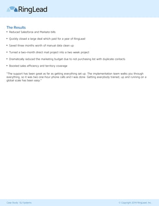Sli Systems, a SaaS company that provides site search for e-commerce, faced severe data hygiene issues due to duplicate leads in their CRM system. By partnering with Ringlead, they standardized and cleaned their data, implemented unique entry and upload processes to prevent future duplicates, and significantly reduced time and effort in data management. The solutions not only improved data quality but also helped lower costs and enhance overall sales efficiency.