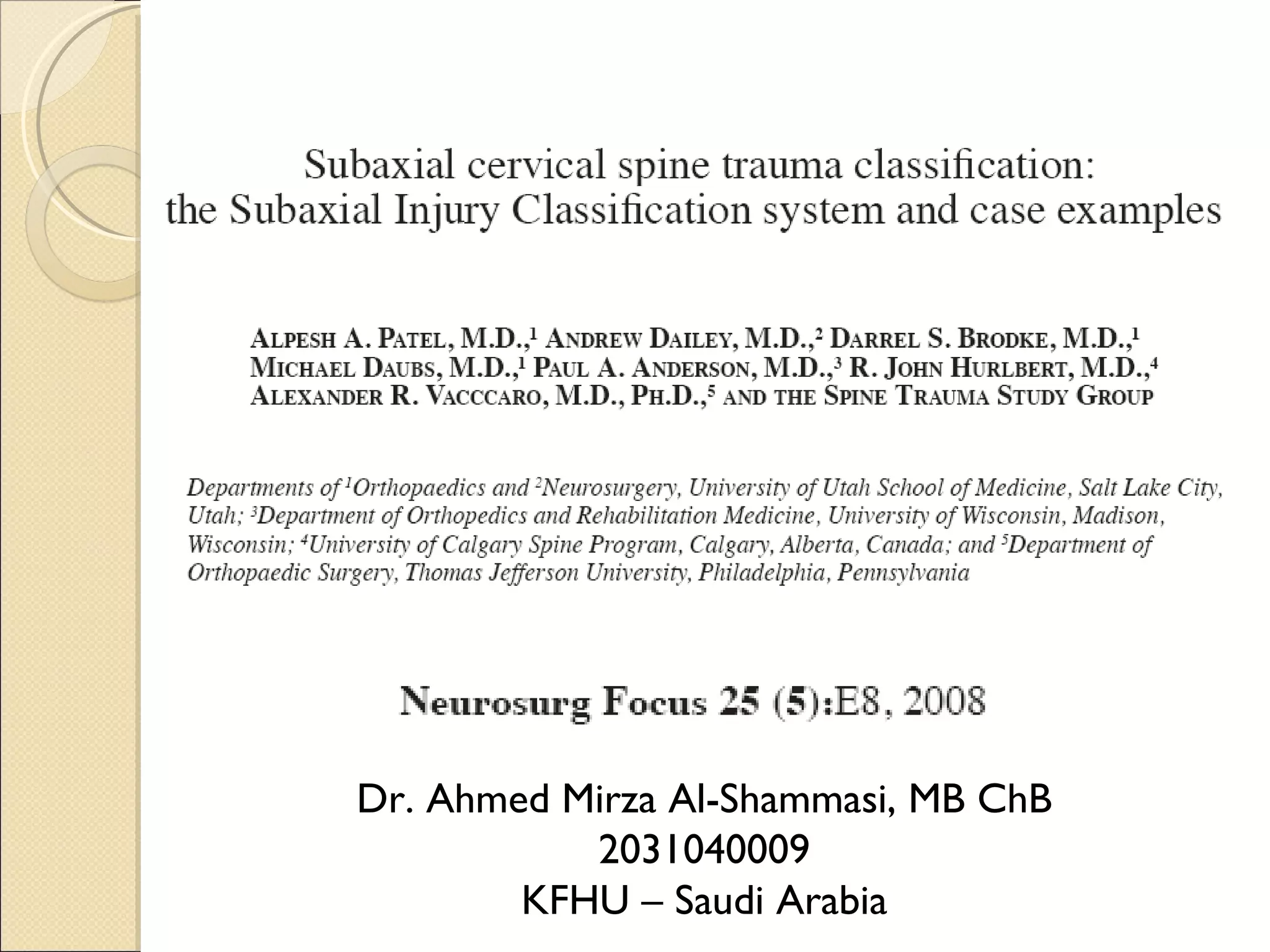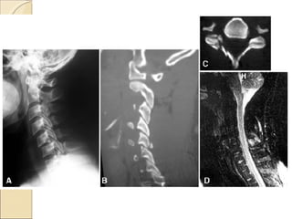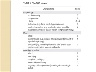 The document outlines a new classification system called SLIC (Subaxial injury classification) for cervical spine injuries. SLIC scores injuries based on 3 major components: injury morphology, integrity of ligaments and discs (DLC), and neurological status. It also includes minor descriptors. The SLIC system is demonstrated through two case examples and is compared to older classification systems. The SLIC system provides standardized treatment guidance based on total score and has shown better inter-rater agreement than prior systems. However, neurological examination and MRI interpretation introduce some subjectivity.