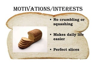 Sliced bread was developed in the early 20th century to make bread more convenient. Otto Rohwedder invented a machine in 1917 that could slice bread, but commercial production began in 1928 at the Chilicothe Baking Company. Slicing bread using a conveyor belt with razor sharp blades allowed bread to be precut and easy for consumers to use. Sliced bread became a staple household item and is considered a major breakthrough in baking convenience.
