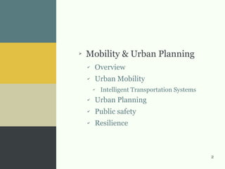 The document discusses urban mobility and planning in smart cities, emphasizing the impact of city design on transportation and public services. It addresses challenges such as reliance on private vehicles, traffic congestion, and pollution, proposing solutions like efficient public transport and intelligent transportation systems. New trends also focus on people-centric urban environments, promoting walkability, accessibility, and resilience against climate change.