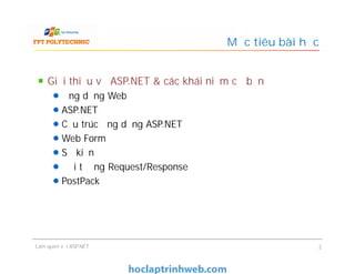 Tài liệu giới thiệu về ASP.NET, một framework giúp xây dựng ứng dụng web động bằng cách kết hợp HTML, CSS, JavaScript và mã kịch bản phía server. Nó mô tả cấu trúc ứng dụng ASP.NET, các mô hình viết mã cho web form và quá trình xử lý sự kiện trong vòng đời của một trang web. Tài liệu cũng trình bày về môi trường phát triển ứng dụng ASP.NET và công cụ Visual Studio.
