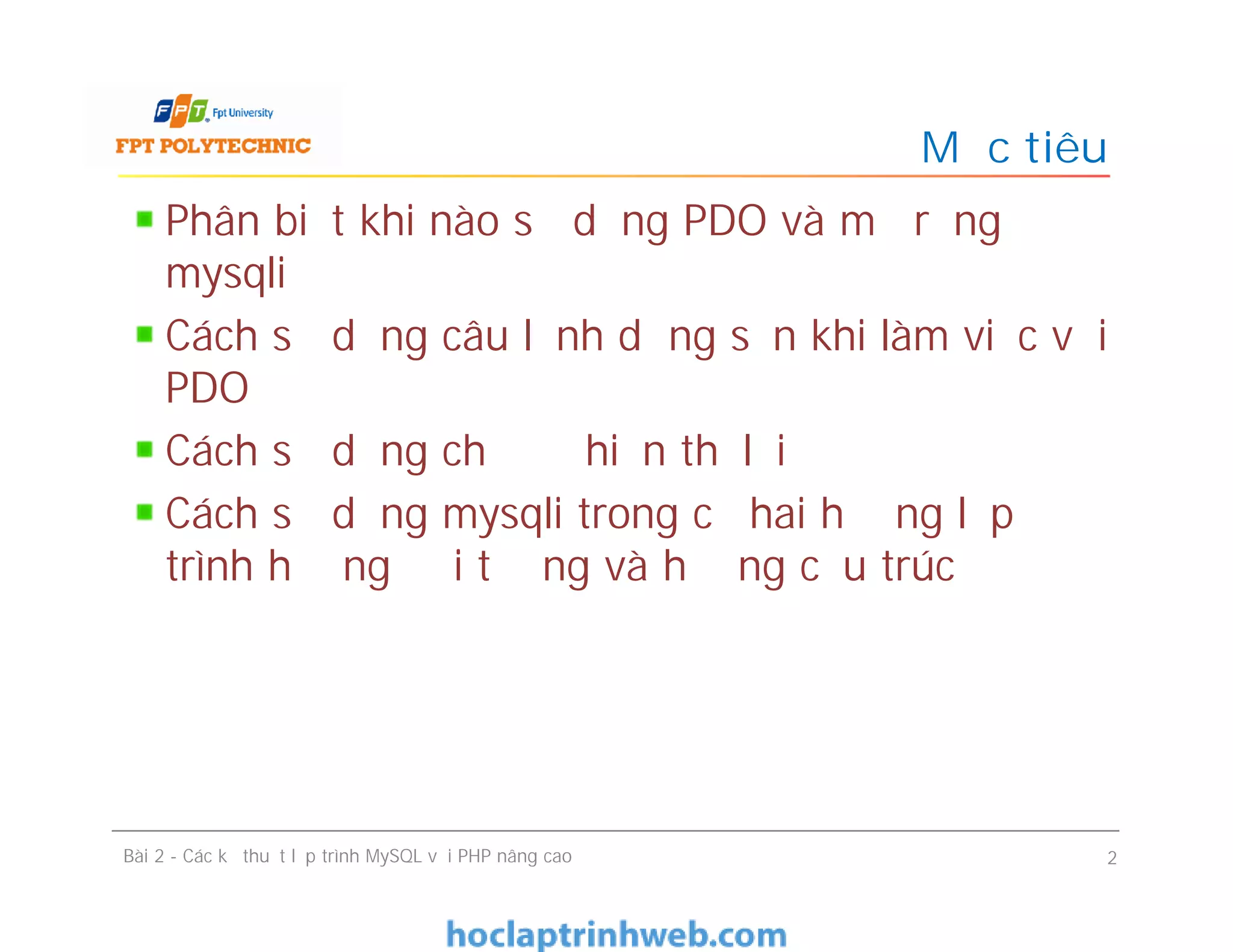 Tài liệu trình bày các kỹ thuật lập trình MySQL với PHP nâng cao, đặc biệt nhấn mạnh sự khác biệt giữa PDO và MySQLi cũng như cách sử dụng các câu lệnh chuẩn và xử lý lỗi. Nó cũng mô tả cách kết nối cơ sở dữ liệu, thực hiện truy vấn, cập nhật dữ liệu và làm việc với các tham số. Cuối cùng, tài liệu nhấn mạnh lợi ích của việc sử dụng câu lệnh dựng sẵn để nâng cao hiệu suất và bảo mật.