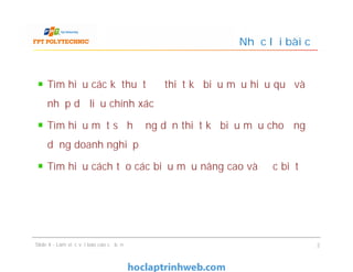 Tài liệu hướng dẫn về việc thiết kế và làm việc với báo cáo trong MS Access, bao gồm các kỹ thuật tạo, định dạng và cấu trúc báo cáo hiệu quả cho doanh nghiệp. Nó cũng trình bày về các thành phần chính của báo cáo, các dạng báo cáo khác nhau, và cách sử dụng các điều khiển trong báo cáo. Đặc biệt, tài liệu cung cấp từng bước chi tiết để tạo báo cáo và các thuộc tính quan trọng cần thiết cho việc hiệu chỉnh báo cáo.