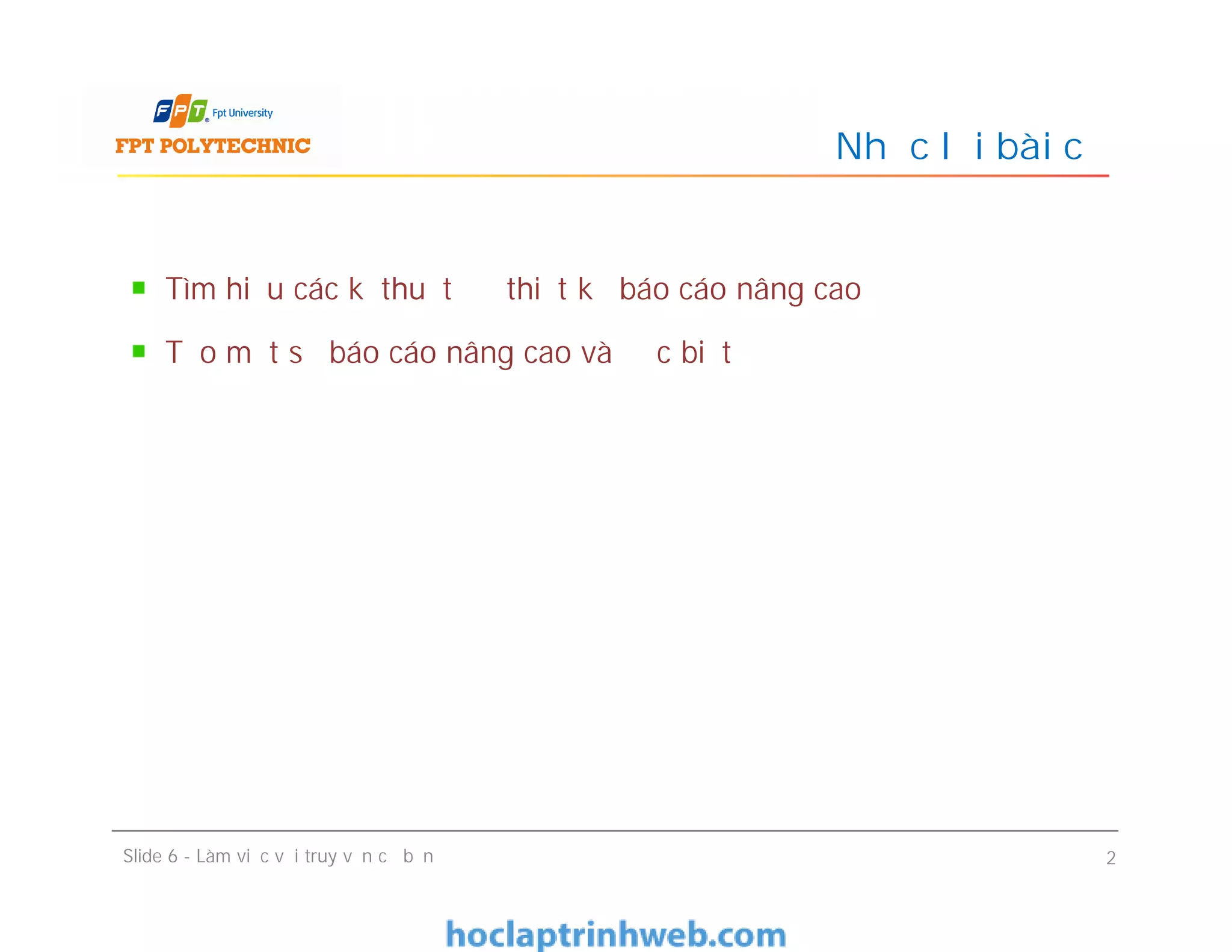 Tài liệu hướng dẫn về cách tạo và thực hiện truy vấn trong cơ sở dữ liệu, bao gồm việc sử dụng công cụ query design và query wizard. Nó trình bày các loại truy vấn như truy vấn đơn giản, crosstab, tìm bản ghi trùng và duy nhất, cùng với cách xây dựng biểu thức tiêu chuẩn. Cuối cùng, tài liệu nhấn mạnh quy trình trích xuất và lựa chọn dữ liệu từ các bảng kết hợp các tiêu chuẩn đã định nghĩa.