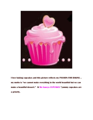 This document discusses the author's passion for baking cupcakes, with their motto being about making beautiful desserts. It mentions Ms Nancy's Cupcakes, where making yummy cupcakes is a priority.