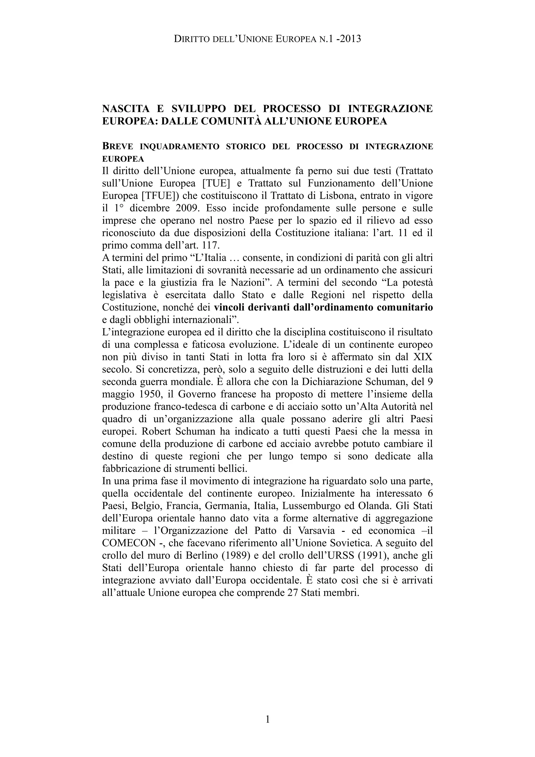 Il documento analizza la nascita e lo sviluppo del processo di integrazione europea, evidenziando l'importanza dei trattati dell'Unione Europea e delle disposizioni costituzionali italiane che ne regolano l'applicazione. Viene descritto l'evolversi del diritto dell'Unione, partendo dalla Comunità europea del carbone e dell'acciaio fino ad arrivare all'Unione Europea attuale, composta da 27 stati membri, e al processo di creazione del mercato unico. Sono infine discusse le sentenze della Corte di Giustizia Europea che hanno definito diritti e obblighi per cittadini e stati membri, stabilendo il primato del diritto comunitario.
