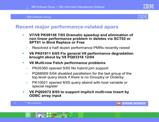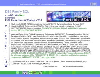 - New features in recent DB2 releases including support for longer SQL statements in ODBC, improved monitoring of real storage usage, and preliminary support for IBM's Enterprise Workload Manager
