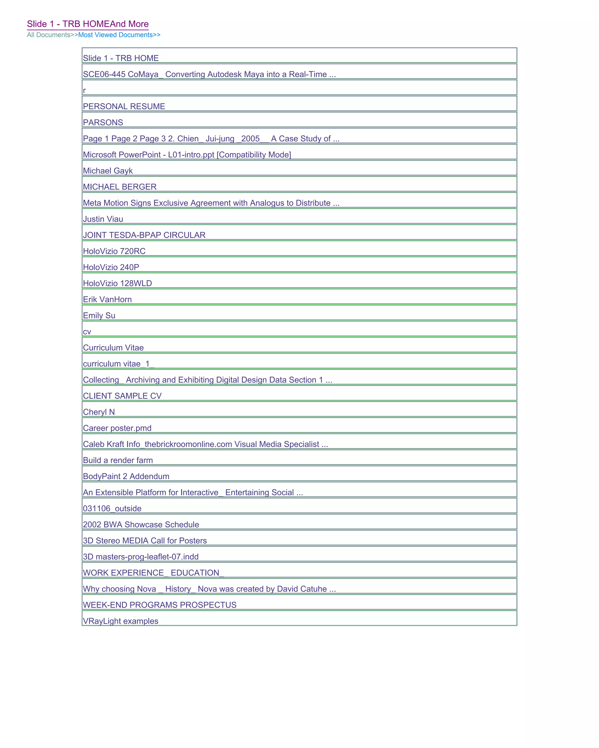 The document provides a list of over 30 file names and document titles. It appears to be an automatically generated list of the most viewed documents on a shared network drive. The files cover a range of topics from resumes and CVs to 3D modeling and rendering files and documentation.