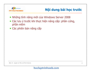 Bài học tập trung vào quản trị file và print server trên Windows Server 2008, bao gồm cấu hình, khắc phục sự cố hệ thống file share, mã hóa dữ liệu với EFS và BitLocker. Nội dung cũng đề cập đến việc cải tiến truy cập file qua SMB, cũng như các tùy chọn bảo mật và quản lý in mạng. Cuối cùng, bài học kết thúc với khái niệm về file share, NTFS permissions và printer pooling.