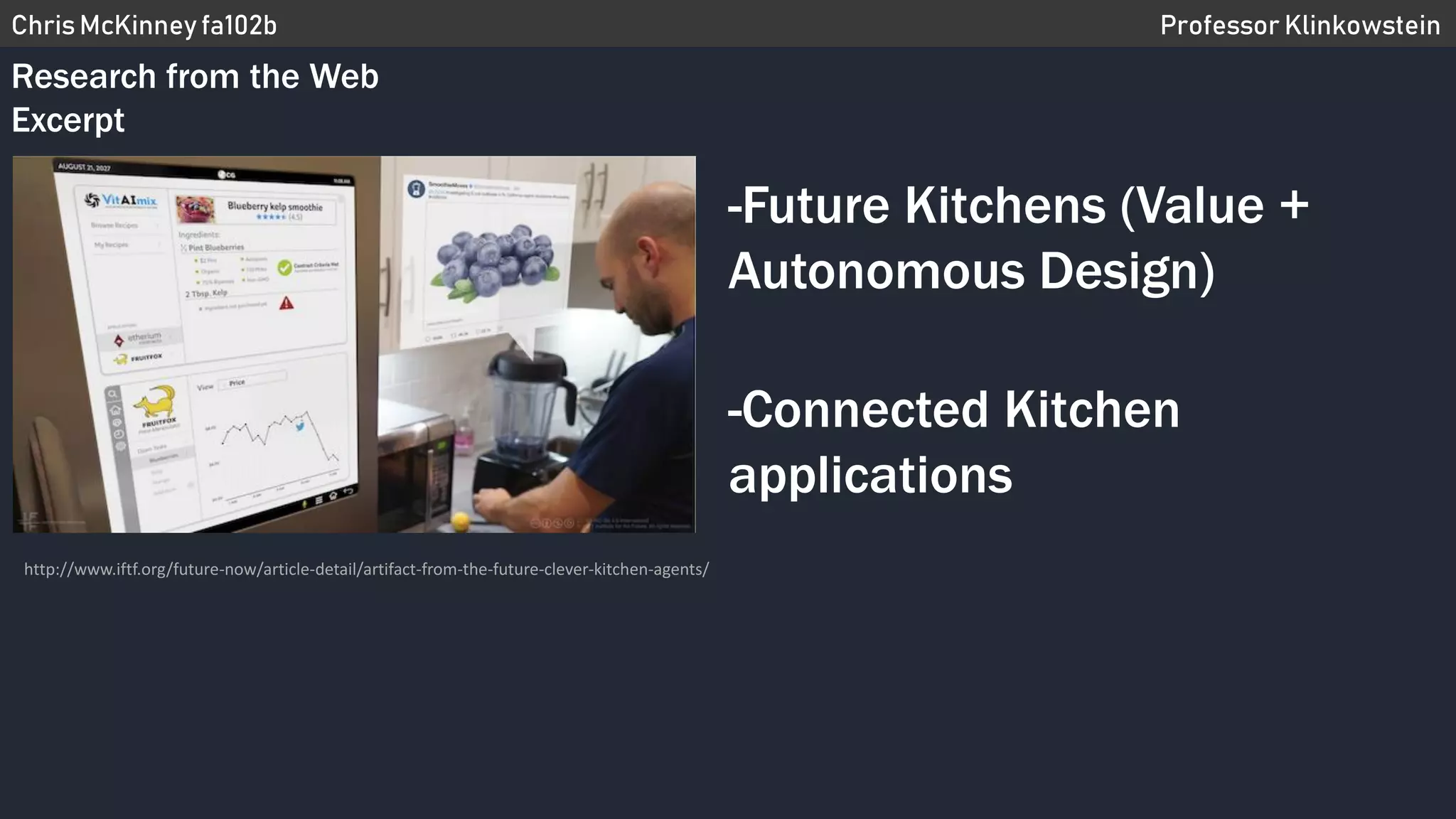 This document discusses future kitchen technologies and connected kitchen applications. It focuses on autonomous kitchen design and "Clever Kitchen Agents" that can assist users. The source is an excerpt from the Institute for the Future discussing how kitchens may evolve to become more intelligent and automated spaces.
