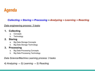 This document discusses the process of collecting, storing, processing and analyzing big data. It covers the key concepts and technologies for collecting data using tools like Apache Sqoop and Kafka, storing data using clusters, file systems, NoSQL databases and concepts like sharding and replication. It also discusses processing data using parallel and distributed processing with Hadoop, and analyzing data using Apache Phoenix which provides a SQL interface to query HBase databases.