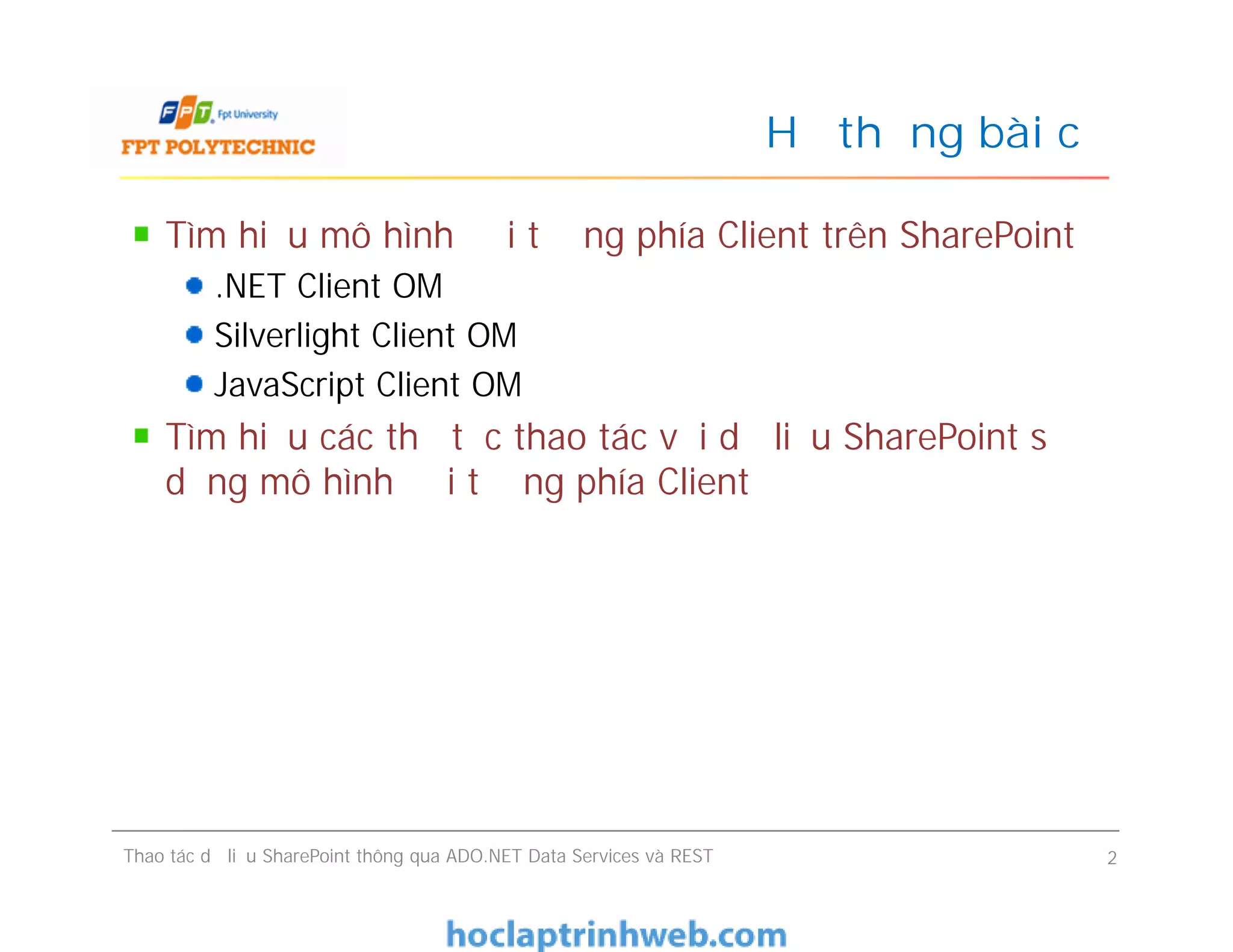 Tài liệu trình bày về cách thao tác với dữ liệu SharePoint thông qua ADO.NET Data Services và REST, đặc biệt trong môi trường SharePoint 2010. Nó giải thích các API như .NET, Silverlight và JavaScript để truy vấn và thao tác dữ liệu và mô tả các động từ HTTP sử dụng trong REST như GET, POST, PUT và DELETE. Tài liệu cũng cung cấp hướng dẫn cụ thể về cách thiết lập và sử dụng ADO.NET Data Services để truy vấn và chỉnh sửa dữ liệu trong SharePoint.