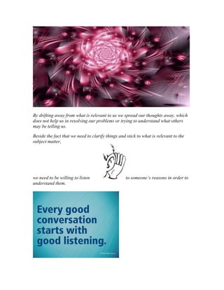 Sticking to what is relevant helps us resolve problems and understand others, as drifting away from relevance spreads our thoughts too widely. We must clarify and focus on the subject matter, and listen to understand someone's reasons.