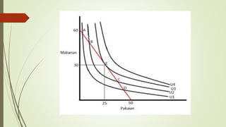Dokumen ini membahas teori perilaku konsumen, mencakup faktor-faktor yang mempengaruhi permintaan konsumen seperti pendapatan, selera, dan harga. Teori ini dibedakan menjadi pendekatan kardinal dan ordinal, serta menjelaskan konsep nilai guna marginal dan surplus konsumen. Selain itu, dijelaskan hubungan antara perubahan harga, efek penggantian, dan pendapatan terhadap permintaan barang.