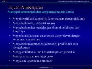 Dokumen ini membahas siklus akuntansi perusahaan pemanufakturan, termasuk karakteristik dan proses klasifikasi biaya, serta penyusunan laporan kos produksi. Perusahaan pemanufakturan mengubah bahan baku menjadi barang jadi dan melibatkan pengalokasian biaya untuk berbagai fungsi seperti produksi, pemasaran, dan administrasi. Siklus akuntansi untuk pemanufakturan mencakup penyesuaian dan penutupan buku dengan tujuan menyusun laporan kos yang akurat.