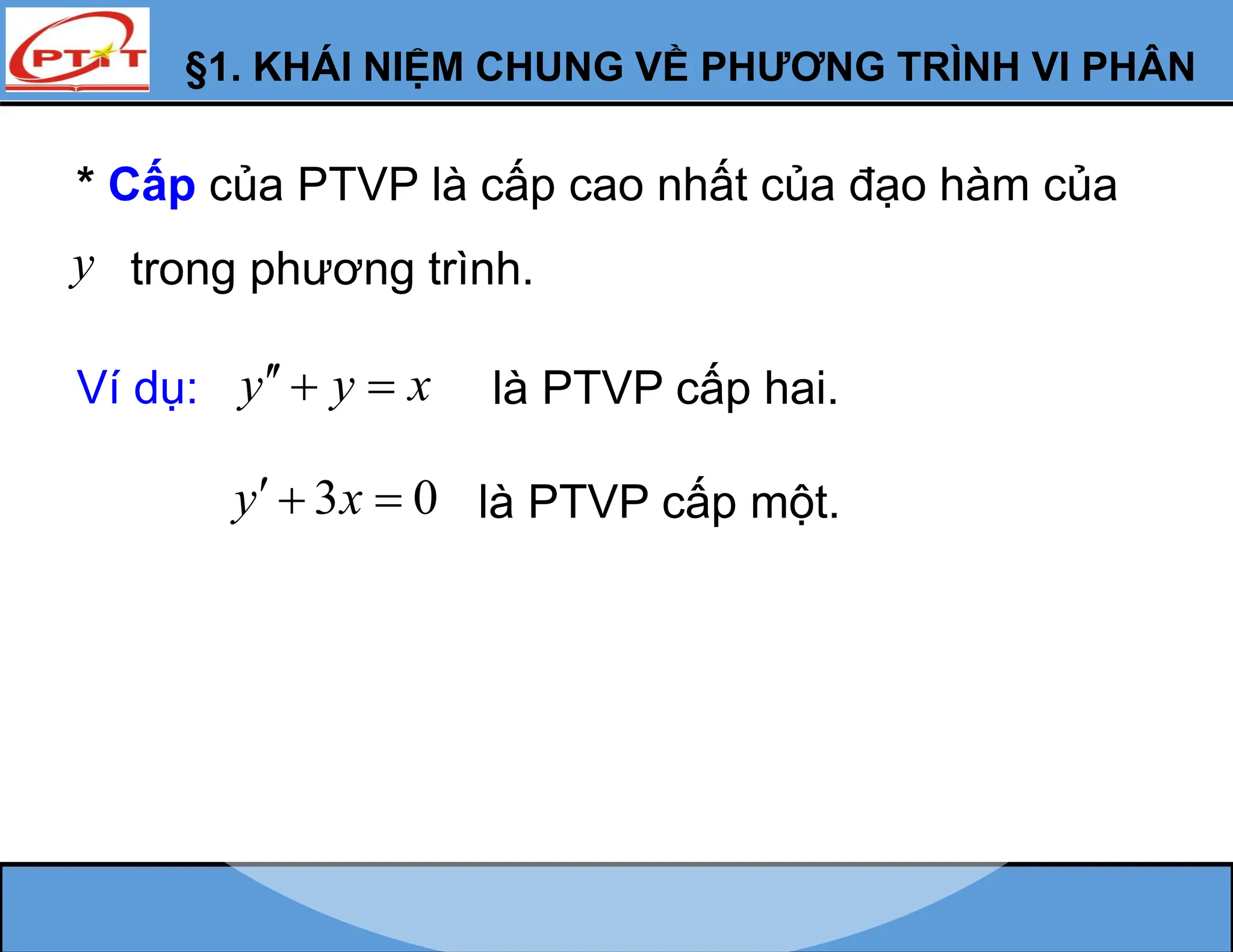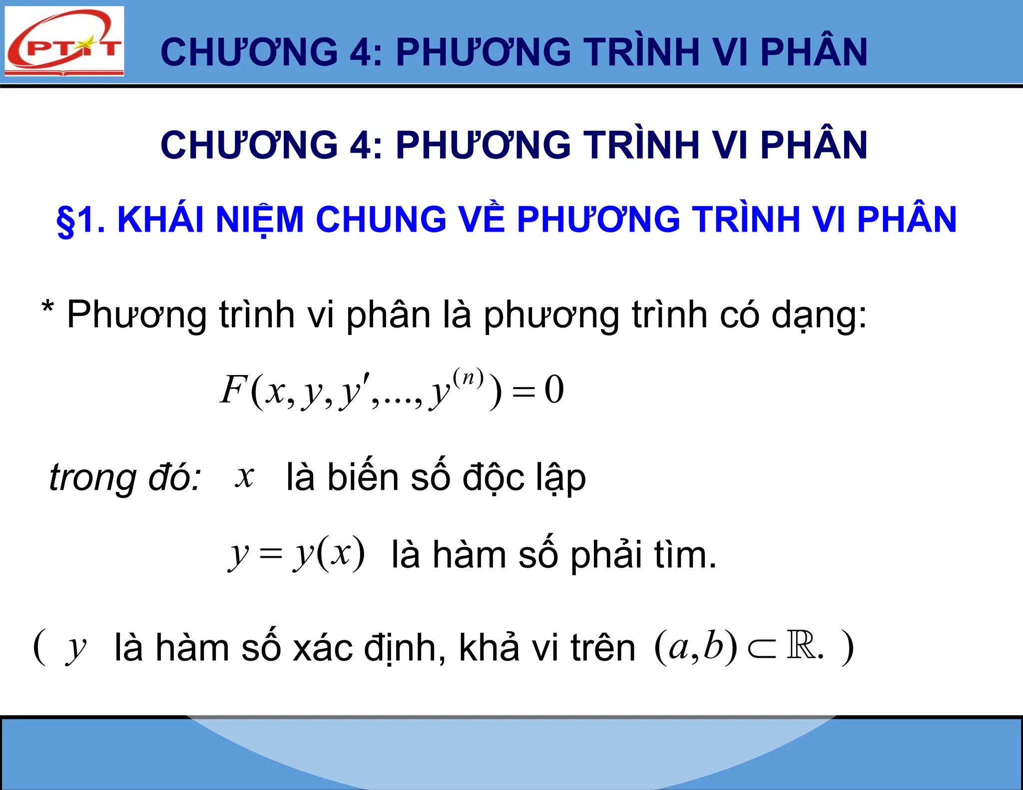 Chương 4 trình bày về phương trình vi phân, định nghĩa và phân loại như phương trình tuyến tính, cấp một, và các phương trình đặc biệt như phương trình đẳng cấp. Tài liệu cung cấp các công thức giải và ví dụ minh họa cho từng loại phương trình, đồng thời nhấn mạnh sự tồn tại và tính duy nhất của nghiệm. Nội dung cũng đề cập đến các nghiệm tổng quát, riêng và kì dị của các phương trình vi phân.