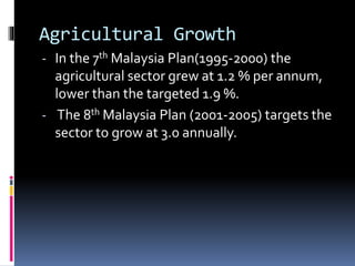 Agriculture contributes to Malaysia's GDP over time as part of the primary economic sector. It is characterized by a dualistic system of plantation and smallholder sectors. While agricultural growth in the 7th Malaysia Plan was below targets, the 8th Plan aims for 3% annual growth. National agricultural policies have positively impacted food production to meet domestic needs and expand exports, while poultry production has increased due to integrated farming systems from fast food chains. Agriculture consistently generates trade surpluses for Malaysia due to palm oil exports, which made up 52% of agricultural exports in 2002. Agricultural employment has declined to 12% of total employment from 42% as Malaysia transformed to a more industrialized economy.