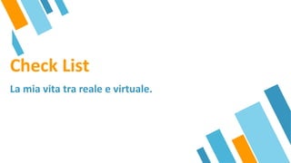 Il documento presenta una checklist per valutare la relazione tra vita reale e virtuale, in particolare l'uso di internet attraverso vari indicatori di comportamento. I punteggi ottenuti da 0 a 48 punti consentono di identificare il grado di controllo o dipendenza dall'attività online. Viene inoltre definita la dipendenza come un cambiamento significativo nella vita dell'individuo dovuto all'eccessivo impegno in attività virtuali.