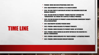 The document outlines the timeline of Pension-House, a health services business unit (SBU), from its creation in 2015 to its current products and services in 2022. It provides an overview of Pension-House's revenue streams, competitors, trends in the industry, problems securing land, target audiences, and current state. It describes Pension-House's goal of bundling its literature, audio, and video products while also providing boarding and lodging through properties like John House and Jane House. Risks include the high cost of property, reliance on an individual in South Korea, and difficulties finding a supporting physician.