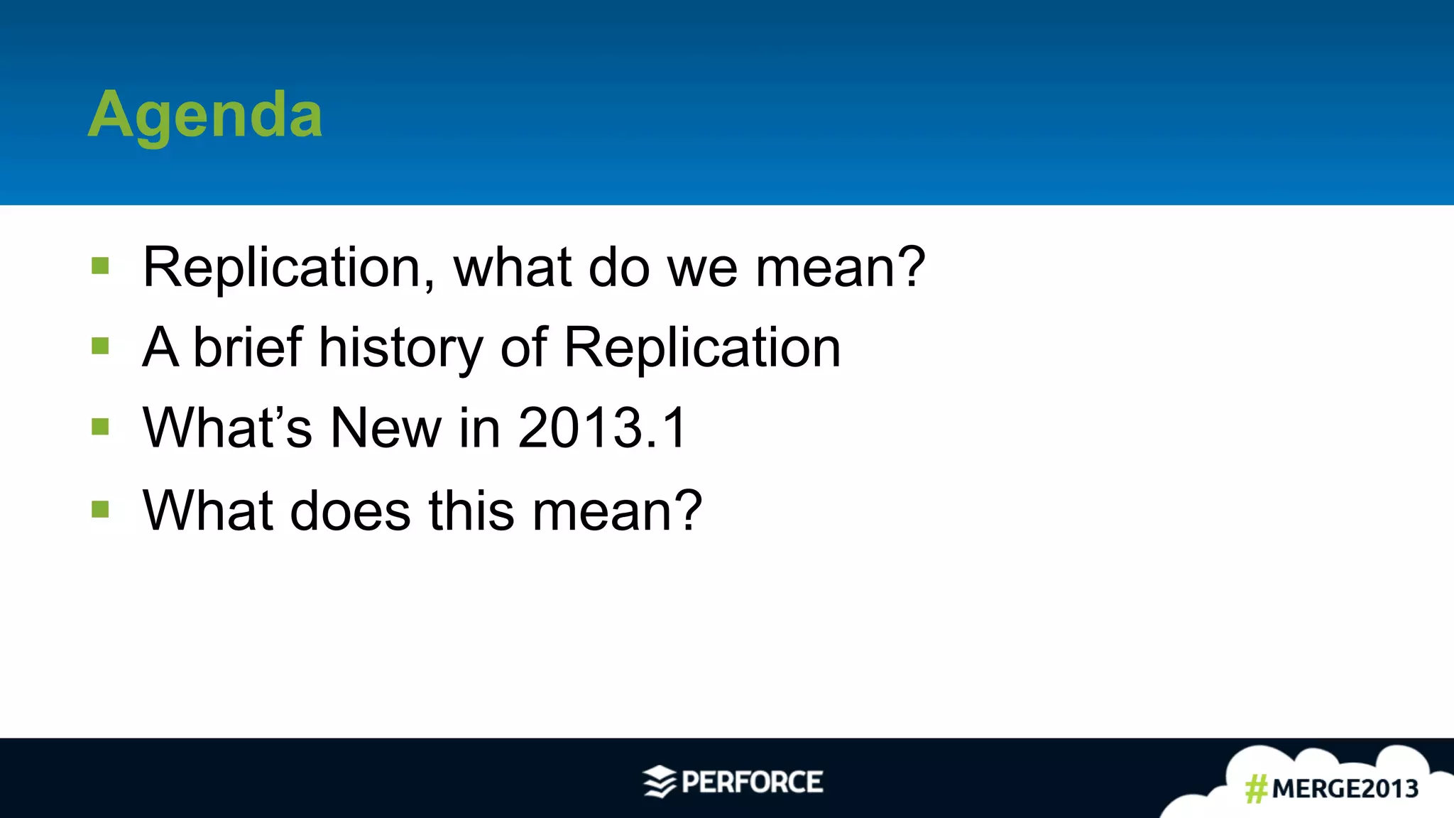The document discusses advancements in replication services, specifically focusing on features introduced in the 2013.1 update, including replica chaining, on-demand replication, and replication filtering. It highlights the importance of replication for enhancing reliability and load distribution while providing technical details and examples of configurations. Additionally, it addresses performance considerations and the monitoring of proxy processes to optimize server efficiency.
