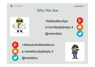 - Chromecast capabilities for multi-screen experiences including the Cast SDK, default/styled/custom media receivers, and remote media playback control.