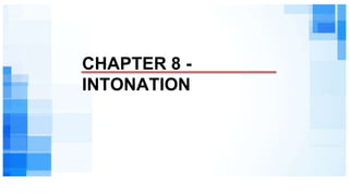 This document summarizes a chapter about intonation from an English phonetics and phonology textbook. It discusses the basic concepts of intonation including speech melody, tone languages vs intonation languages, and the 5 basic tones of yes and no questions. It then explains tone units and the different parts of a tone unit. Finally, it outlines various functions of intonation including attitudinal, discoursal, accentual, grammatical, emotional, textual, indexical, information structure, and psychological functions.