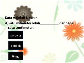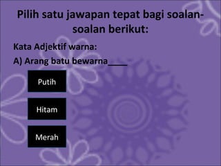 Dokumen tersebut berisi soalan-soalan tentang kata adjektif dengan pilihan jawaban tunggal. Setiap soalan diikuti oleh umpan balik yang menyatakan jawaban pengguna salah atau benar. Dokumen tersebut juga memberikan rujukan untuk tatabahasa bahasa Melayu.