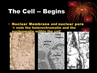 This document provides a histology slide list that summarizes key structures and functions seen across various tissue and cell types, including the nucleus, chromatin, mitochondria, rough ER, smooth ER, Golgi complex, microvilli, centrioles, desmosomes, blood cells, epithelial cells, connective tissue, glands, integumentary system, cartilage, bone, and muscle. Key structures are highlighted on photomicrographs with labels indicating their location.