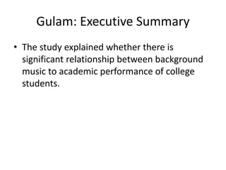 This document summarizes an empirical study conducted at De La Salle University that examined the effect of background music on college students' academic performance. The study used a sample of 35 random college students and collected data on their cumulative GPA, gender, time spent listening to music per week, time spent studying per week, and preference for pop music genres. Regression analysis was used to analyze the data and test for relationships between the variables. The results found that time spent listening to music per week and preference for pop music genres had a significant effect on students' academic performance. The study concluded with recommendations to expand the analysis to include additional variables and focus sampling within one educational institution.