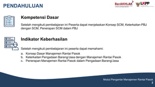 Modul ini membahas konsep dasar manajemen rantai pasok, keterkaitan pengadaan barang dan jasa dengan manajemen rantai pasok, serta penerapan manajemen rantai pasok dalam pengadaan barang dan jasa pemerintah."