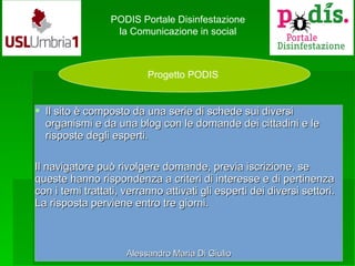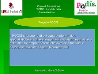 Il progetto PODIS è un portale informativo dedicato alla disinfestazione, fornendo risorse specialistiche sui diversi organismi infestanti e rispondendo alle domande dei cittadini attraverso esperti del settore. Gli utenti possono iscriversi per porre domande, ricevendo risposte entro tre giorni, e il portale ha attratto un buon numero di visitatori dalla sua attivazione nel 2015. Il portale conta su un team di 23 esperti, tra cui medici, agronomi e biologi, per aggiornare e gestire le informazioni disponibili.