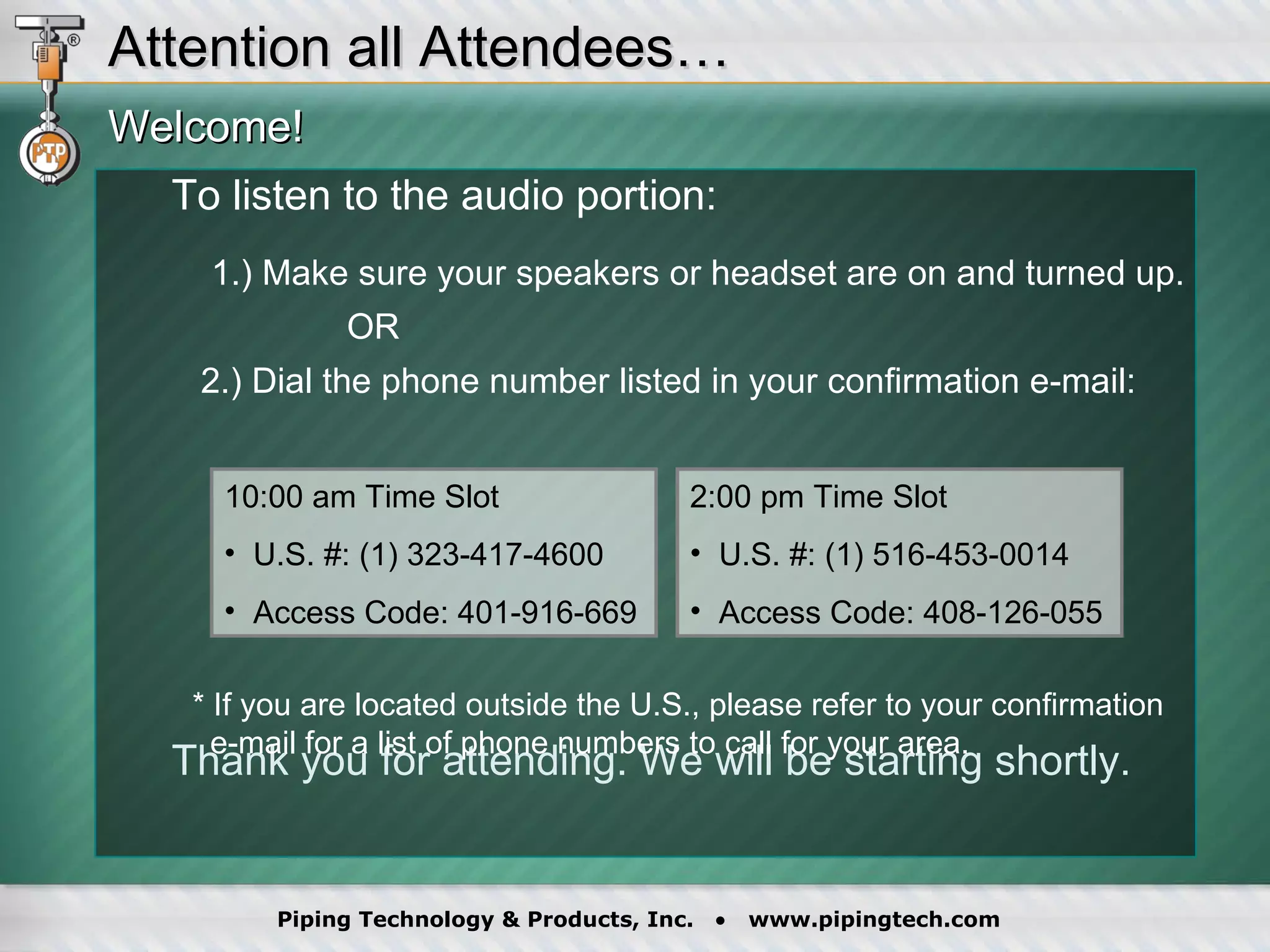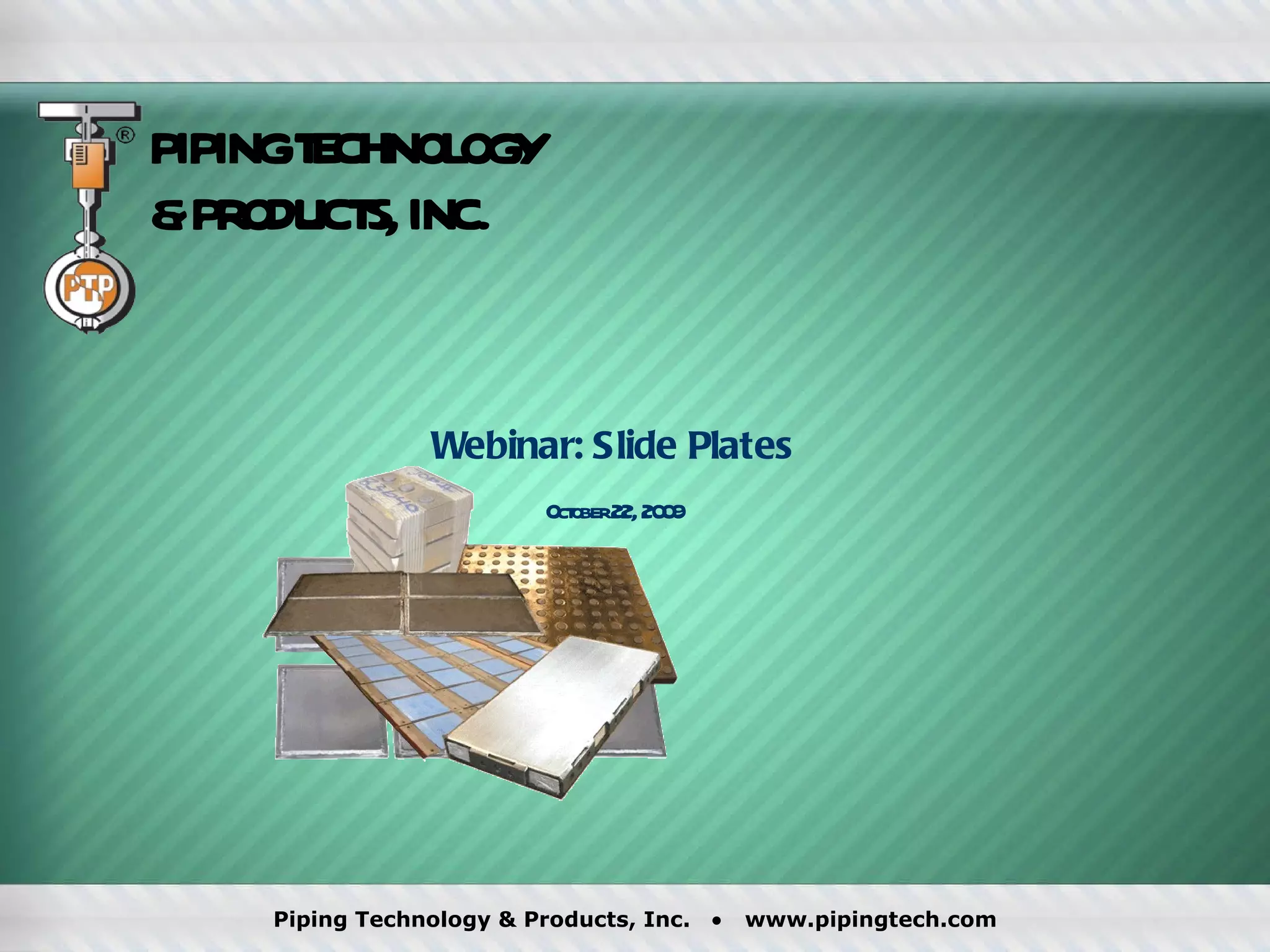 The document is an announcement for a webinar by Piping Technology & Products, Inc. on slide plates, including details about audio access and time slots for attendees. It also provides information about the company's certifications, product offerings, and engineering services related to slide plates and pipe supports.