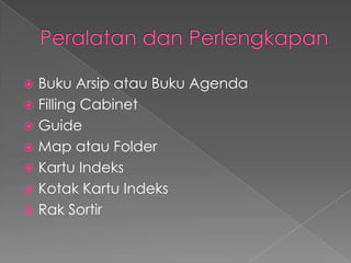 Dokumen ini menjelaskan manajemen kearsipan dengan sistem terminal digit, termasuk peralatan seperti buku arsip dan kartu indeks. Terdapat prosedur penyimpanan dan penemuan kembali arsip dengan pengindeksan berdasarkan nomor kode. Beberapa contoh surat dan transaksinya disertakan untuk ilustrasi sistem pengarsipan.