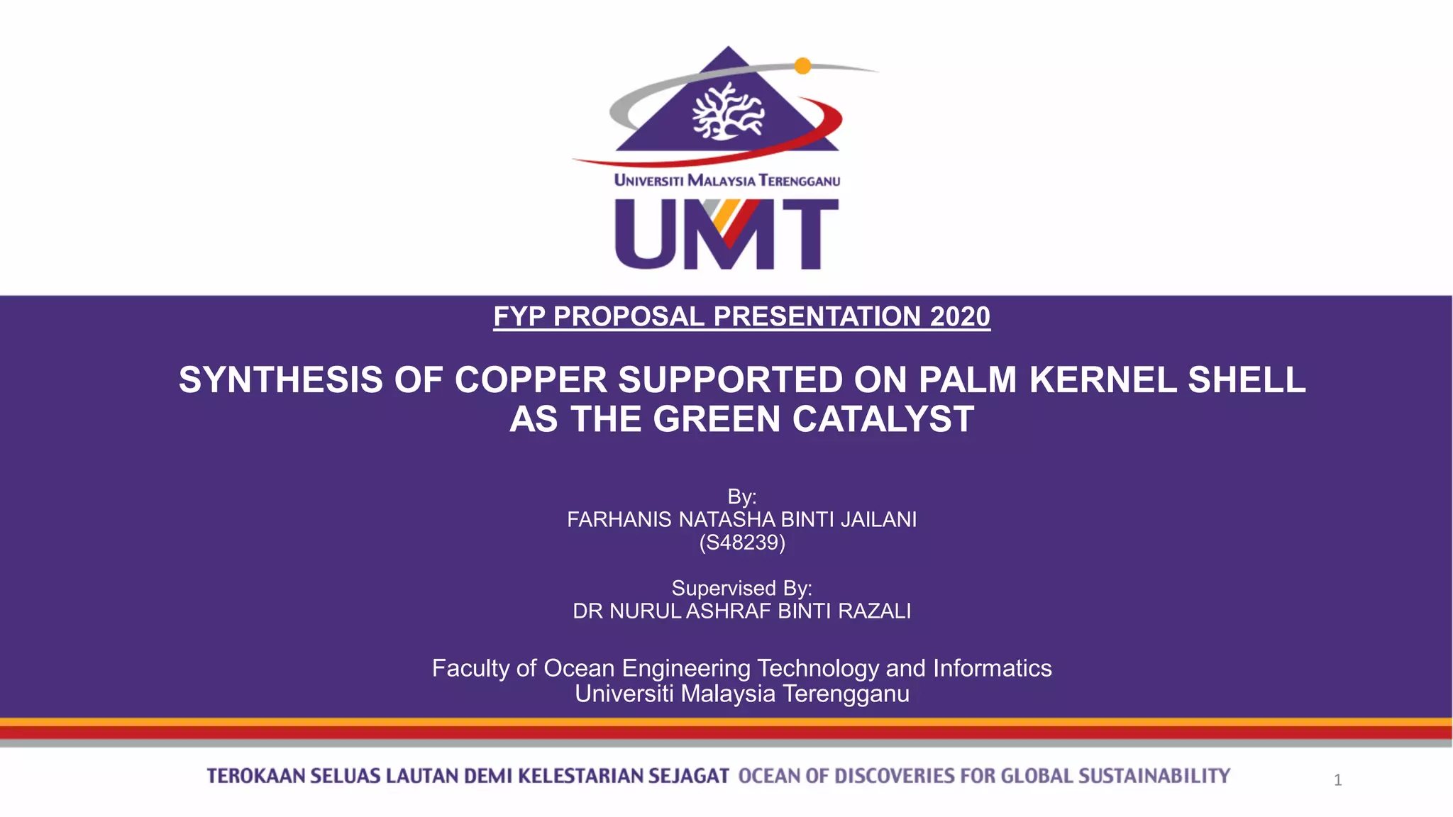 This document presents a proposal for a study on synthesizing copper supported on palm kernel shell as a green catalyst. The objectives are to synthesize a green catalyst from palm kernel shell doped with copper, study its morphology, and optimize reaction conditions for the carboxylation of glycerol to glycerol carbonate. Characterization techniques like SEM, ATR-FTIR, and XRD will be used. The methodology involves preparing the catalyst via impregnation, carrying out the catalytic reaction while varying temperature, catalyst loading, time and pressure, and analyzing products using FTIR and GC-MS. Expected results are morphological analysis of the palm kernel shell and changes with pyrolysis. The conclusion is that palm kernel shell