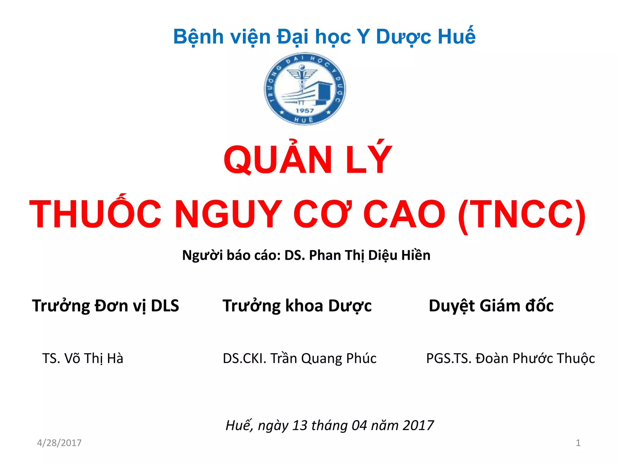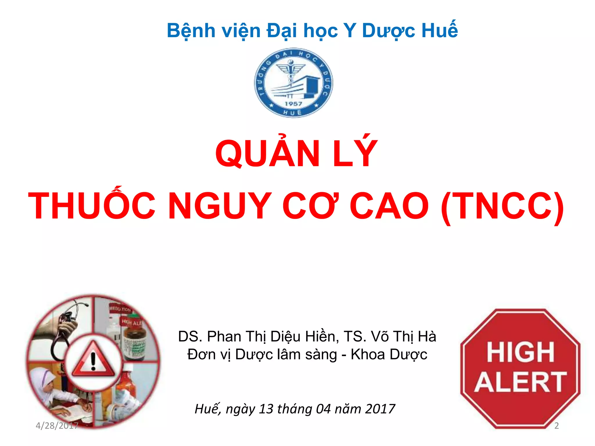 Tài liệu cung cấp hướng dẫn quản lý thuốc nguy cơ cao (TNCC) để đảm bảo an toàn trong việc kê đơn, cấp phát và sử dụng thuốc. Nó bao gồm định nghĩa, các loại sai sót thường gặp, và các chiến lược giảm thiểu rủi ro liên quan đến thuốc TNCC. Đặc biệt, tài liệu nhấn mạnh tầm quan trọng của việc theo dõi bệnh nhân và áp dụng quy trình quản lý chặt chẽ để tránh sai sót nghiêm trọng.