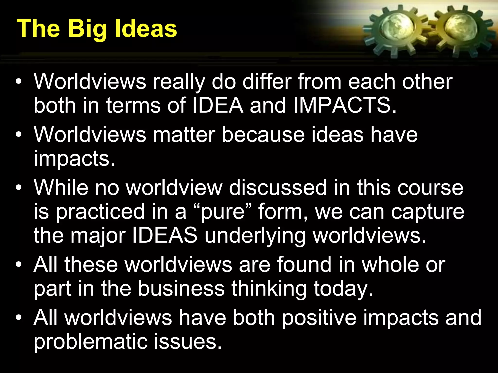 The document contrasts different worldviews in business through a framework of locus of reality and value sets. It discusses several worldviews including cultural relativism, ethical egoism, Kantian ethics, natural law ethics, utilitarianism, and virtue ethics. For each view, it outlines key propositions, potential positives, and problems or challenges. The overall document provides a philosophic structure to analyze and compare different approaches to ethics and decision making in business.